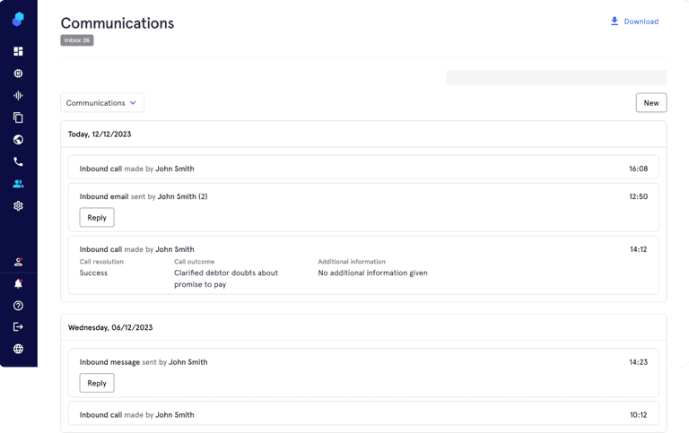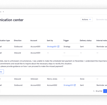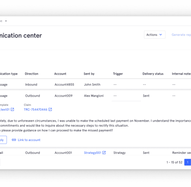 Specifically, there is no place where agents can respond to emails or messages from debtors, no centralized view of all communications (including those sent from automated strategies), and no way to download and store records of these interactions. Agents need a solution that provides a complete, easily accessible overview of all communication touchpoints, both manual and automated, to optimize engagement and ensure seamless responses.