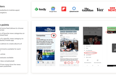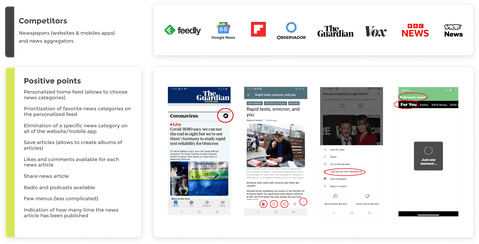 We did a complete competitive analysis of both direct and indirect competitors. We analyzed similar newspapers and news aggregators so we could see in what way do they communicate with their target market segment, analyzing their strengths and weaknesses. Below is a summary of positive insights taken from this analysis.